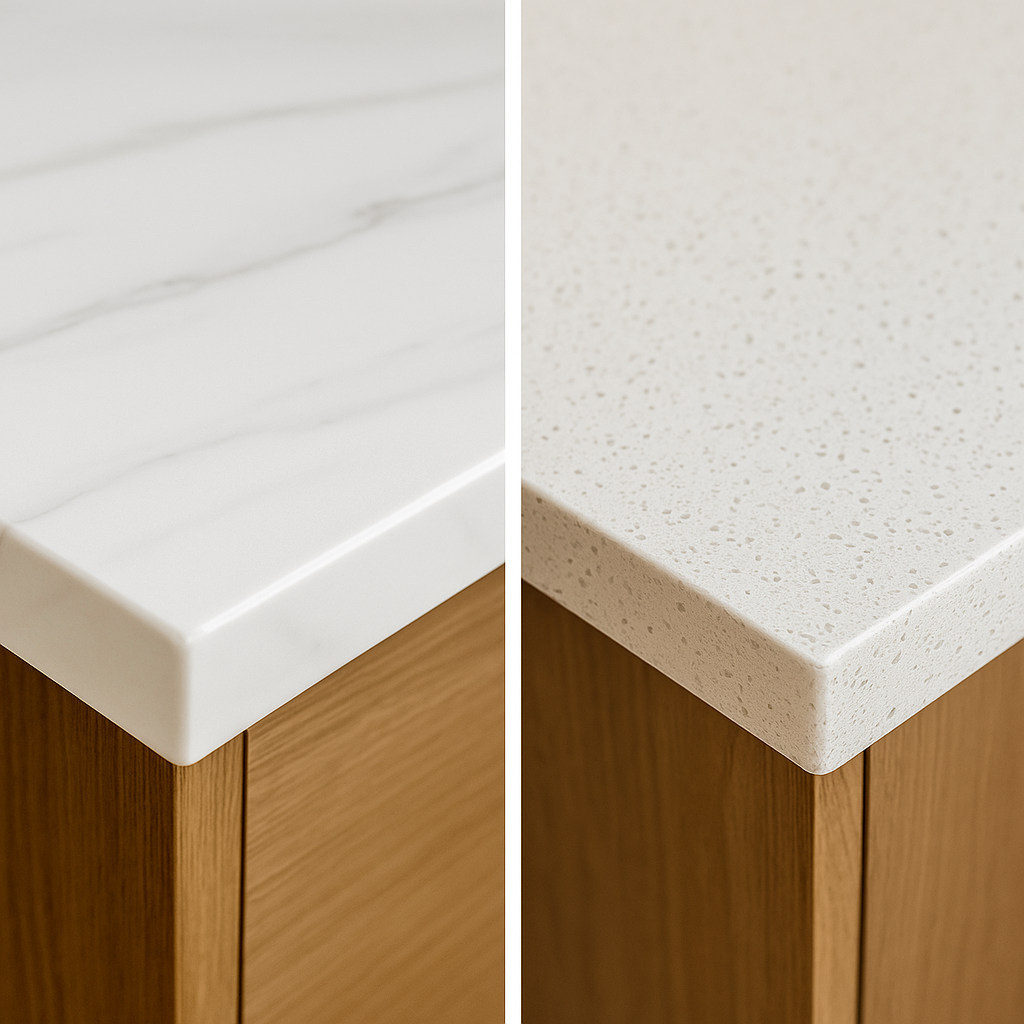 Quartz countertops are engineered for strength, making them more durable and less prone to chipping compared to porcelain. While porcelain offers a sleek, modern look and is UV-resistant, quartz delivers unmatched impact resistance and longevity — ideal for high-traffic kitchens and bathrooms.